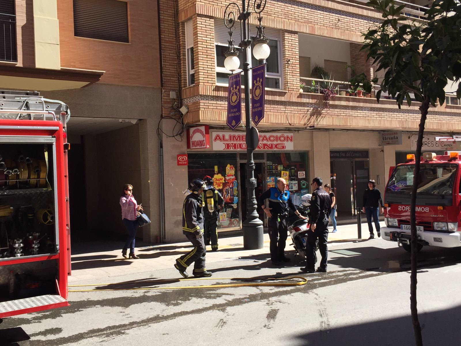 Miembros del cuerpo de Bomberos acudieron a la extinción de un incendio en una vivienda de la Calle de Nogalte, en el barrio del Carmen de la ciudad de Lorca.
