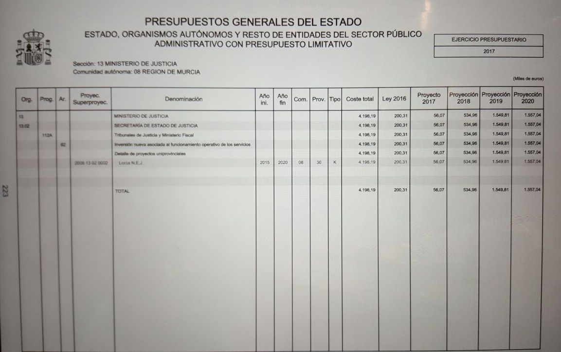 Mateos denuncia la falta de compromiso del Gobierno de Mariano Rajoy para con la construcción de esta infraestructura judicial en la ciudad de Lorca, una vez han comprobado en el borrador de los Presupuestos Generales del Estado para el ejercicio de 2017, que el Ejecutivo nacional únicamente prevé destinar 56.000 euros.