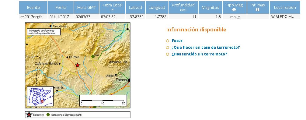 Esta pasada madrugada de miércoles, 1 de noviembre, Día de Todos los Santos, un leve seísmo de magnitud 1,8 se ha dejado sentir entre los vecinos del municipio de Aledo (Murcia) a las 03:03 horas de la madrugada.