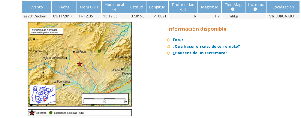 Un leve seísmo de 1,7 ha sido registrado este miércoles, 1 de octubre de 2017, en el noroeste del territorio lorquino, en concreto en la pedanía de La Paca.