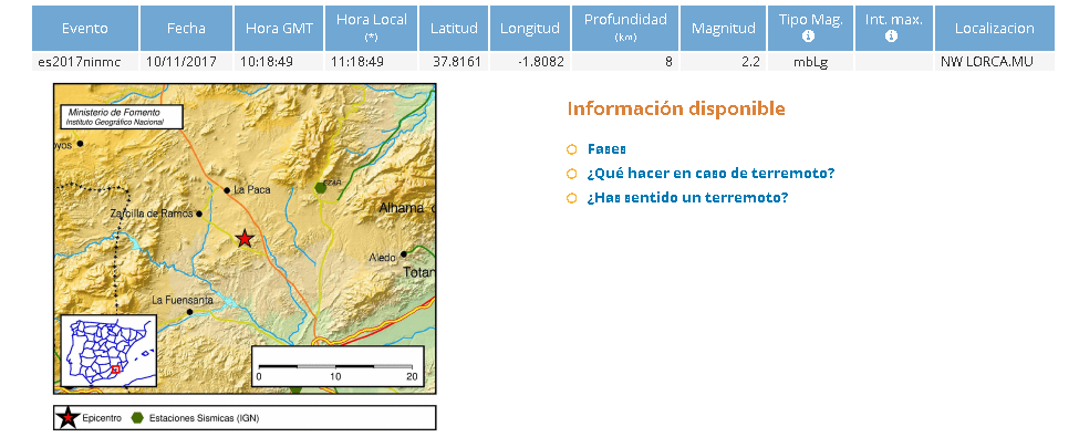 Según el Instituto Geográfico Nacional, un temblor con epicentro localizado al noroeste de Lorca, se dejaba sentir a las 11:18 horas de esta mañana de viernes, día 10 de noviembre.