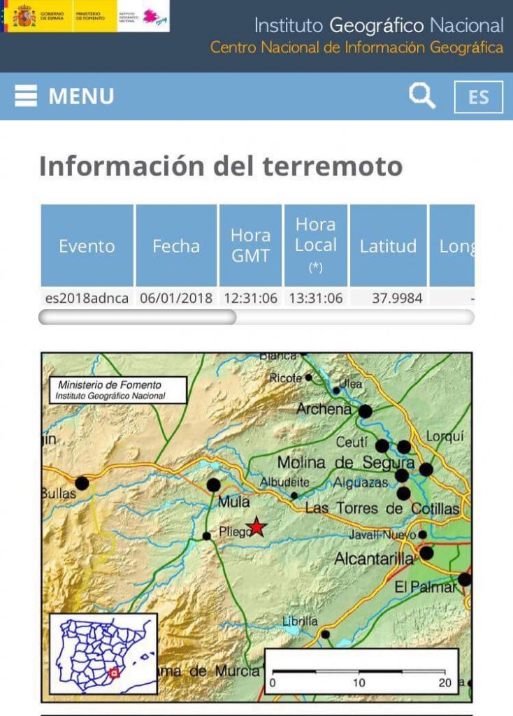Y por último, el pasado día 3 de enero a las 22:32 horas se registró en la web del IGN el primer movimiento en la Región de este 2018. De magnitud 1,7 en la escala de Richter y a una profundidad de 11 kilómetros, el temblor era registrado al suroeste de la localidad de Abarán.