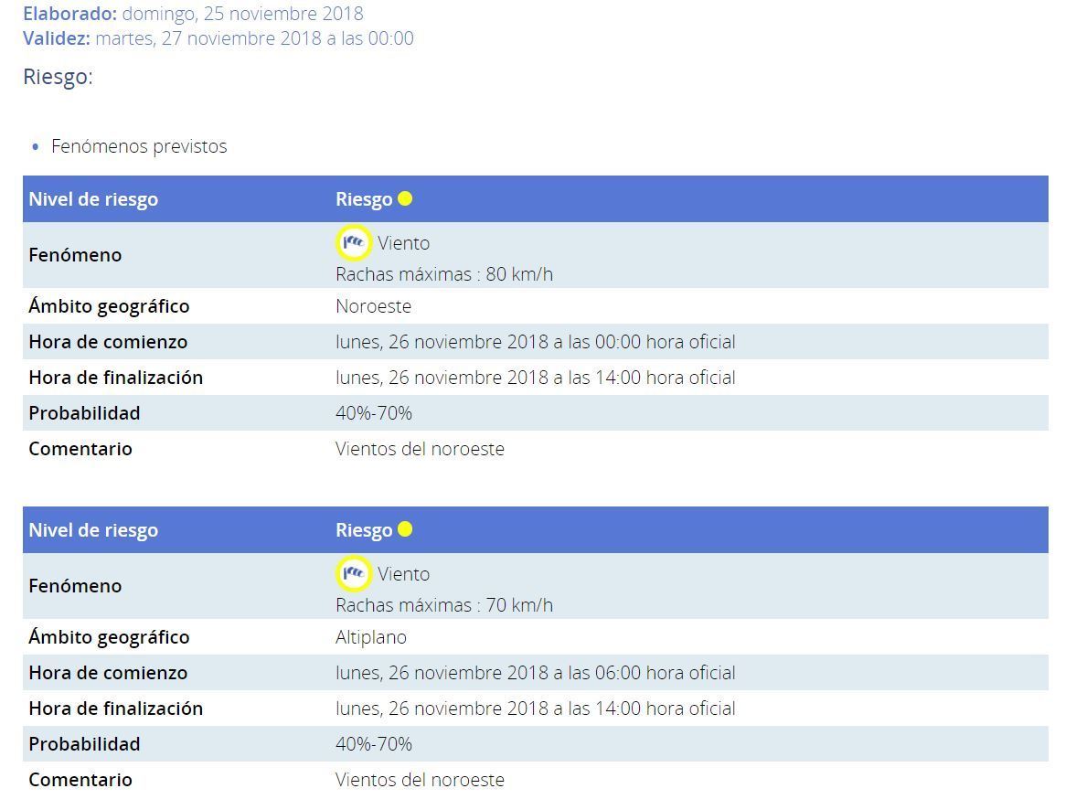 Igualmente la Agencia emite un nuevo aviso AMARILLO por VIENTOS, para mañana, lunes 26 de noviembre, en las zonas del Noroeste y Altiplano.