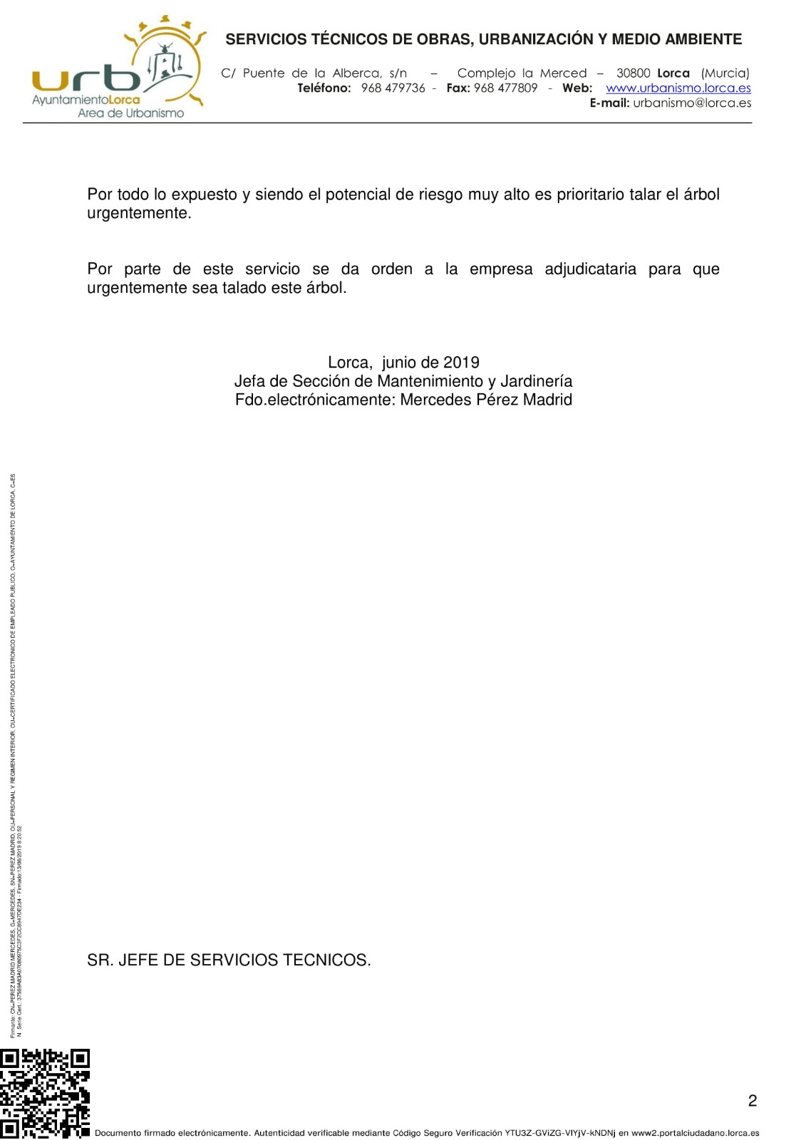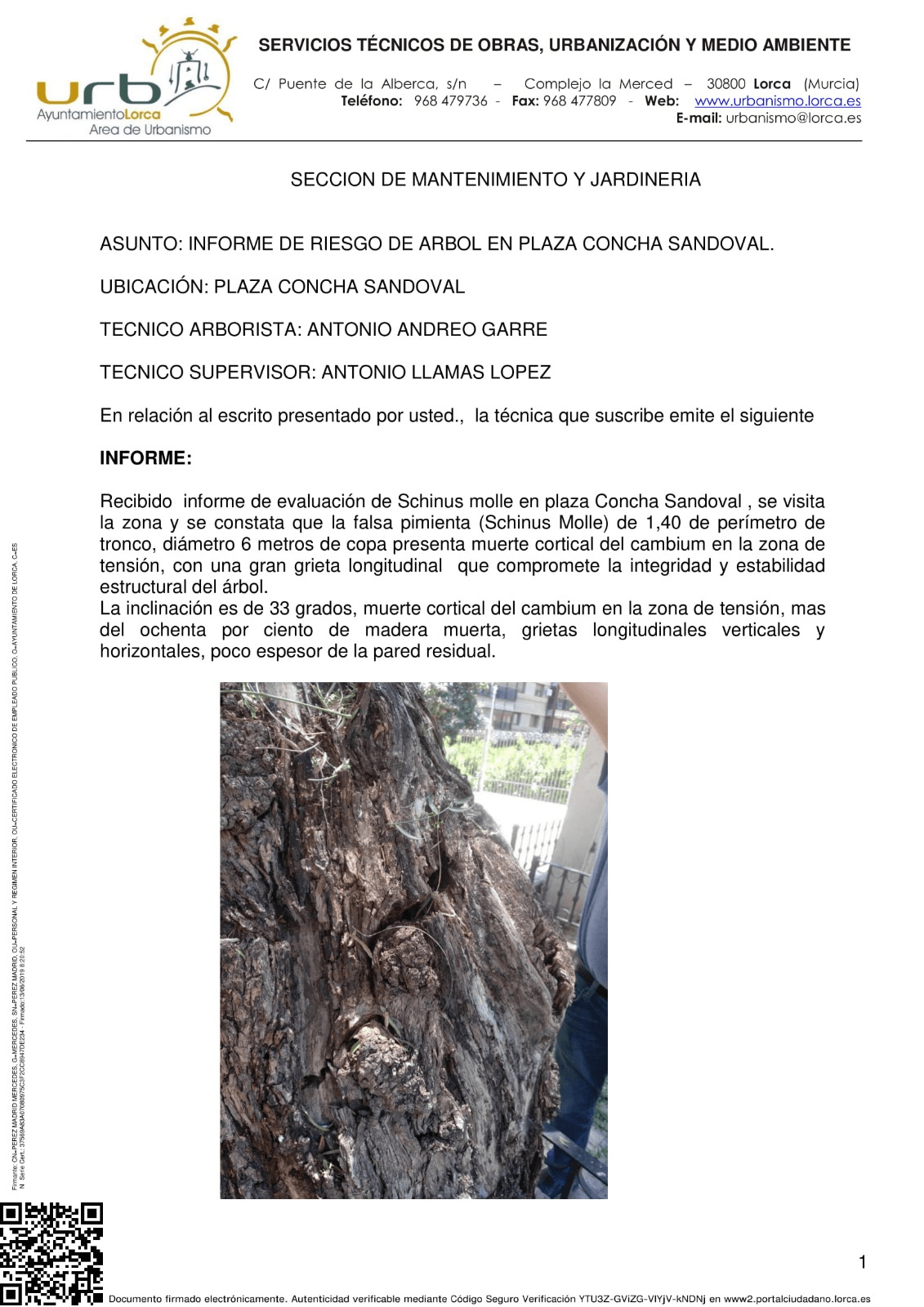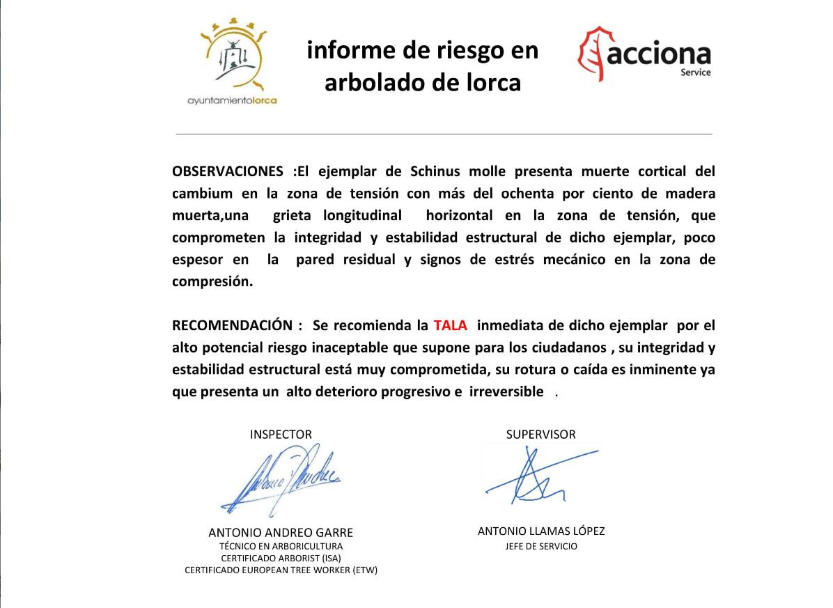 La empresa responsable del mantenimiento de zonas verdes en el casco urbano de Lorca ha elaborado los siguientes informes, donde se aclara el estado del árbol y por qué de su tala: