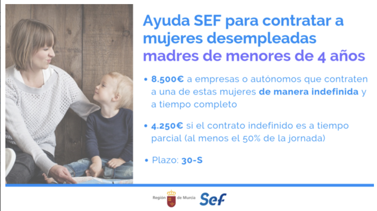 El consejero de Empleo, Investigación y Universidades, Miguel Motas, recordó hoy a las pymes y autónomos de la Región de Murcia que “disponen hasta el 30 de septiembre para solicitar ante el SEF ayudas de entre 3.000 y 9.000 euros para la contratación de desempleados de diversos colectivos, siempre que la naturaleza del contrato sea de carácter indefinido”.