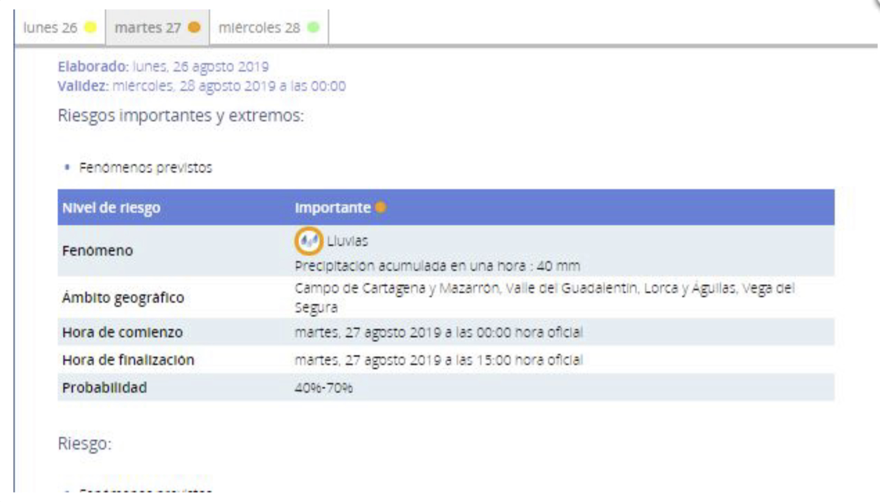 La Agencia Estatal de Meteorología ha elevado a nivel naranja su aviso de fenómenos metorológicos adversos por lluvias previstas para mañana, que pueden llegar a los 40 litros por metro cuadrado en una hora en la Vega del Segura, Campo de Cartagena y Mazarrón y Valle del Guadalentín, Lorca y Águilas.