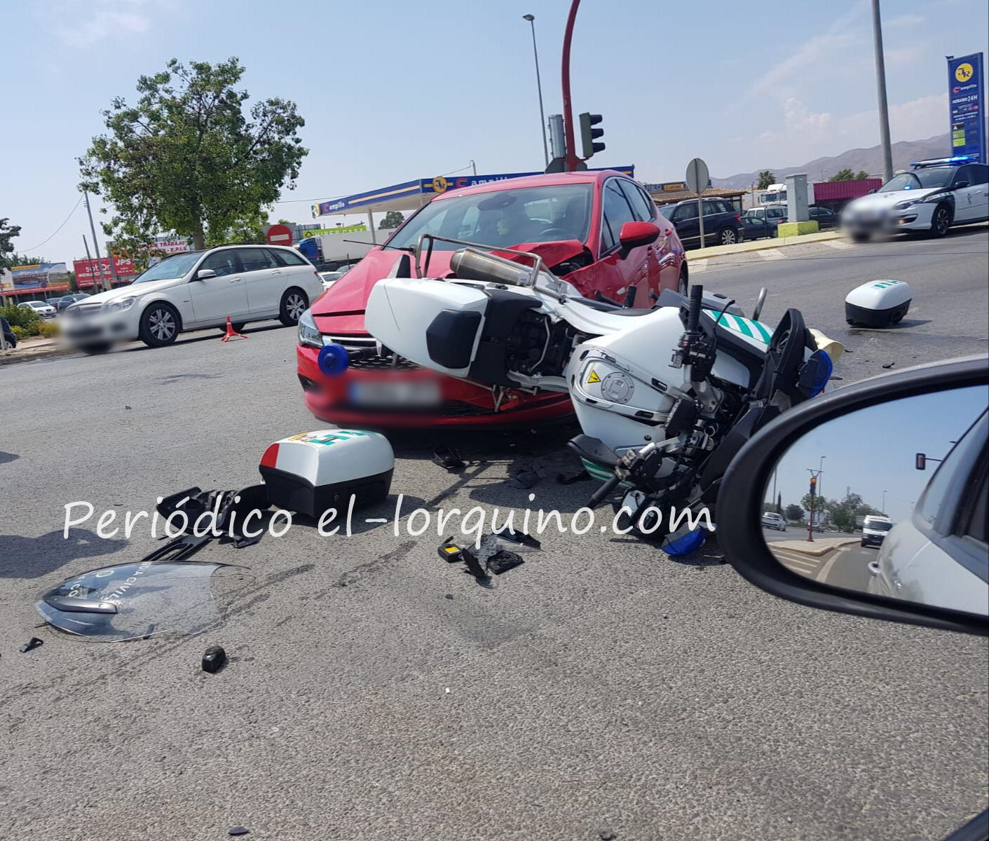 Un turismo arrolló este viernes, 30 de agosto de 2019, a un motorista de la Guardia Civil en Lorca, cerca del Centro Comercial Almenara.