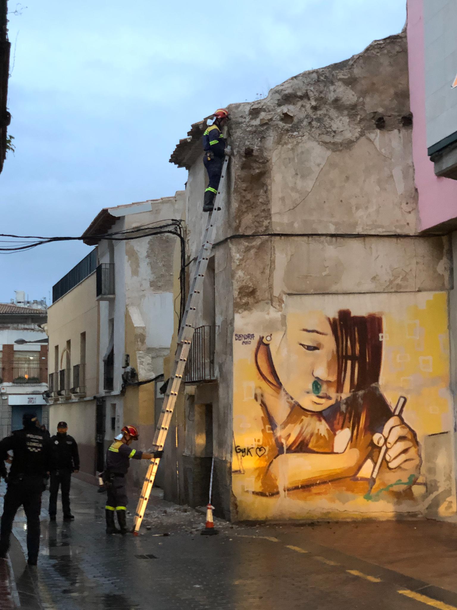 Sobre las 18:00 horas Servicios de Emergencias Municipales han acordonado el paso de vehículos y peatones en carril de caldereros, cerca de la Biblioteca Municipal Pilar Barnes, por desprendimiento de la fachada de una antigua construcción.