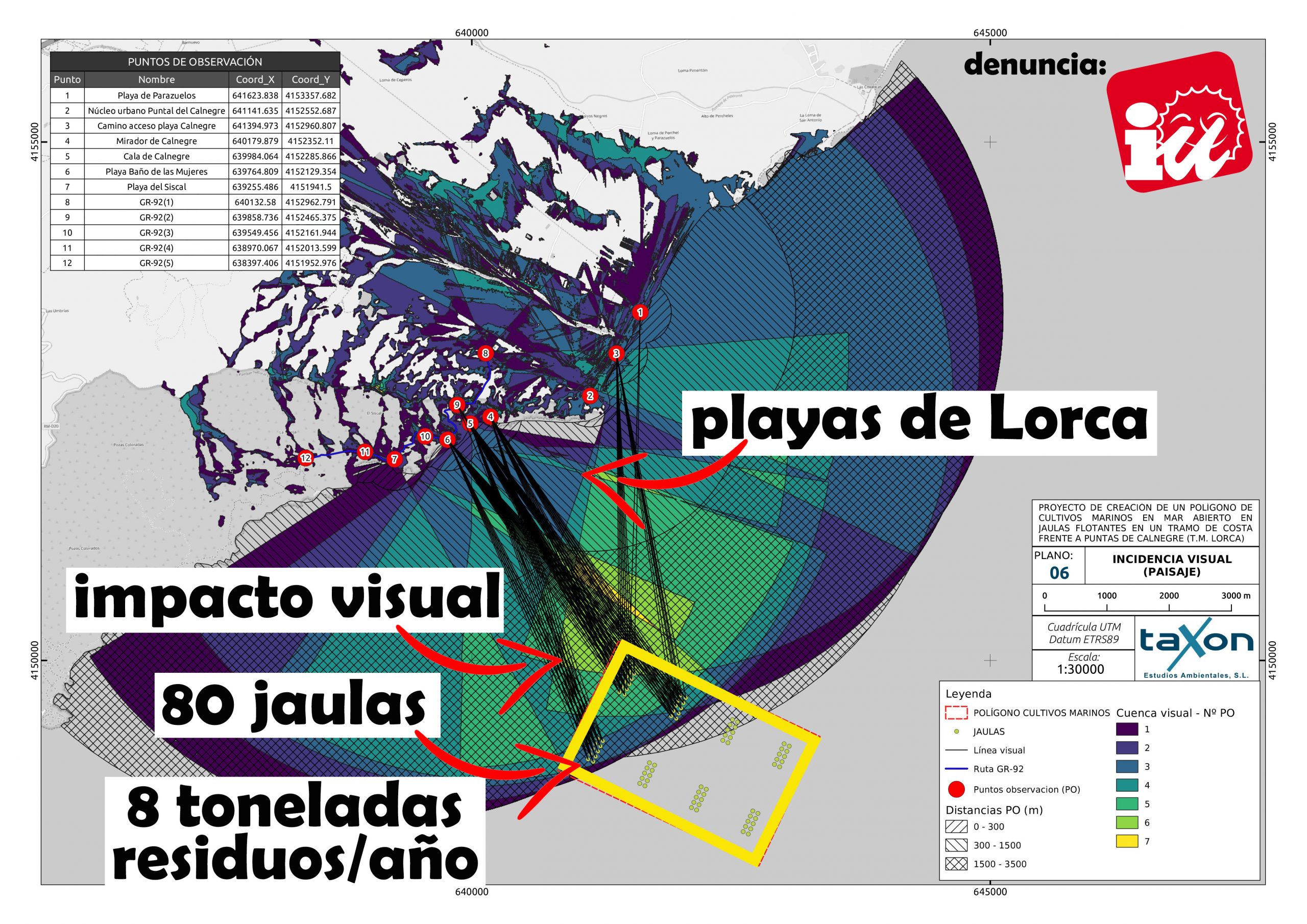Además, la edil de IU-Verdes aludió al “brutal” impacto paisajístico de este polígono acuícola. “Lorca sólo tiene ocho kilómetros de litoral y ahora resulta que justo enfrente de nuestras mejores calas vamos a tener 80 jaulas de 28,6 metros de diámetro cada una a sólo dos kilómetros de la costa”, dijo Martín. “Desde IU-Verdes nos vamos a oponer con uñas y dientes a que nos hurten el horizonte marino sólo para que una empresa privada haga negocio”, aseguró la edil.