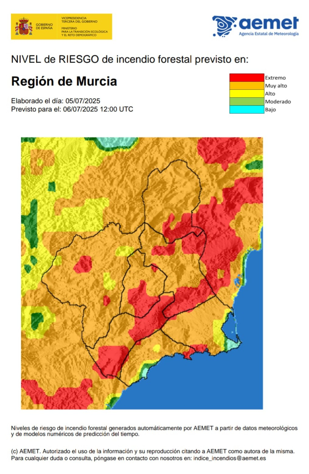 Además, el riesgo será muy alto en el Altiplano, el Noroeste, el Litoral Este y Oeste, la Cuenca de Mula y la Vega Alta-Ricote-Murcia.