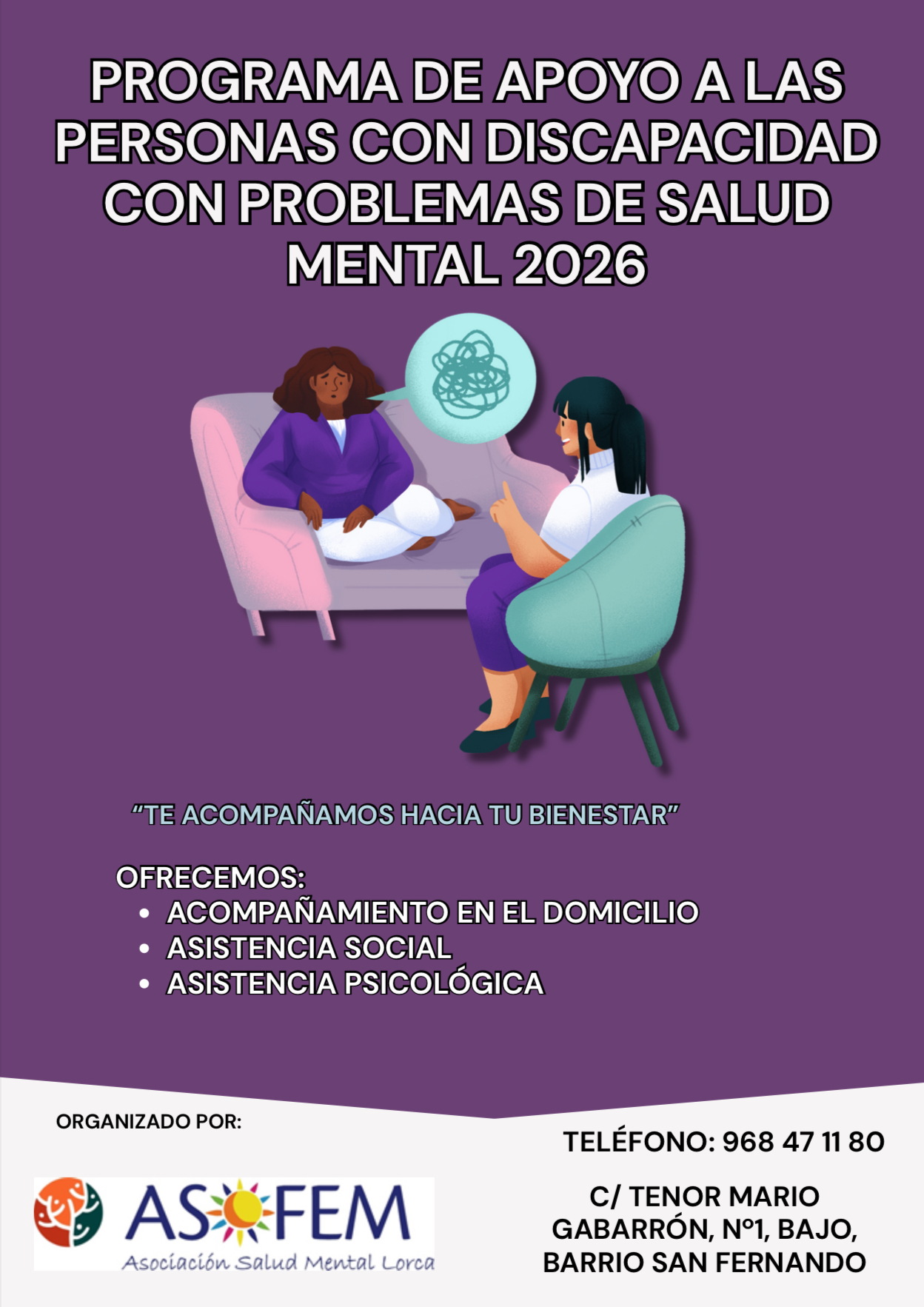 Por estos motivos, ASOFEM – Salud Mental Lorca ofrece un servicio único y prioritario, inexistente en la administración pública, dirigido a reducir el aislamiento y mejorar la conciencia de enfermedad a través de visitas domiciliarias de personal cualificado para la mejora de la calidad de vida de las personas con problemas de salud mental grave, de edad comprendida entre 16 y 65 años, mujeres y hombres, tanto en el ámbito rural como urbano y a sus familias.