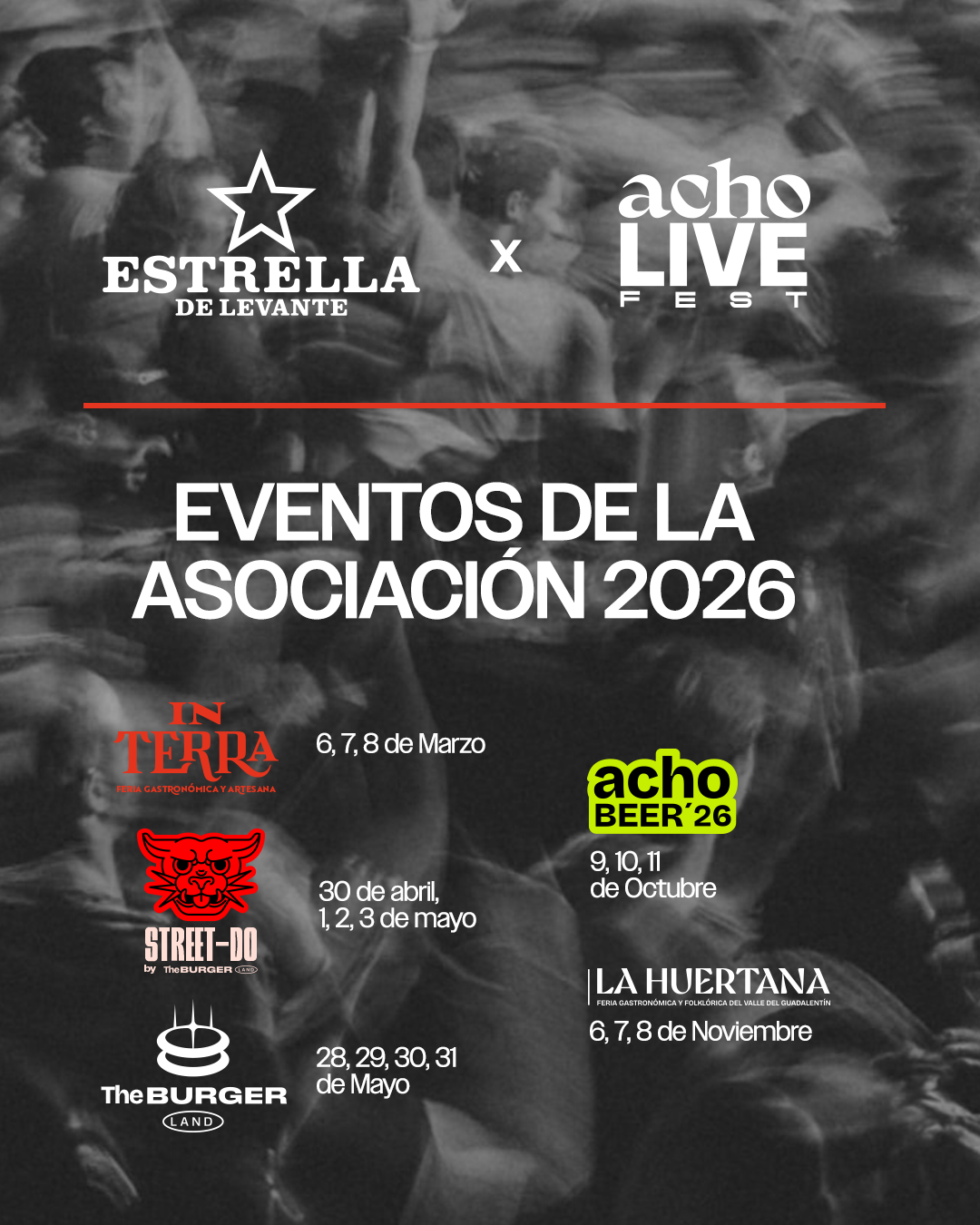 Citas ya consolidadas como Achobeer Fest, Burger Land o La Huertana continuarán formando parte del calendario anual. A ellas se suman nuevas propuestas como In Terra y StreetDO, entre otras iniciativas que serán desveladas durante el acto de presentación.