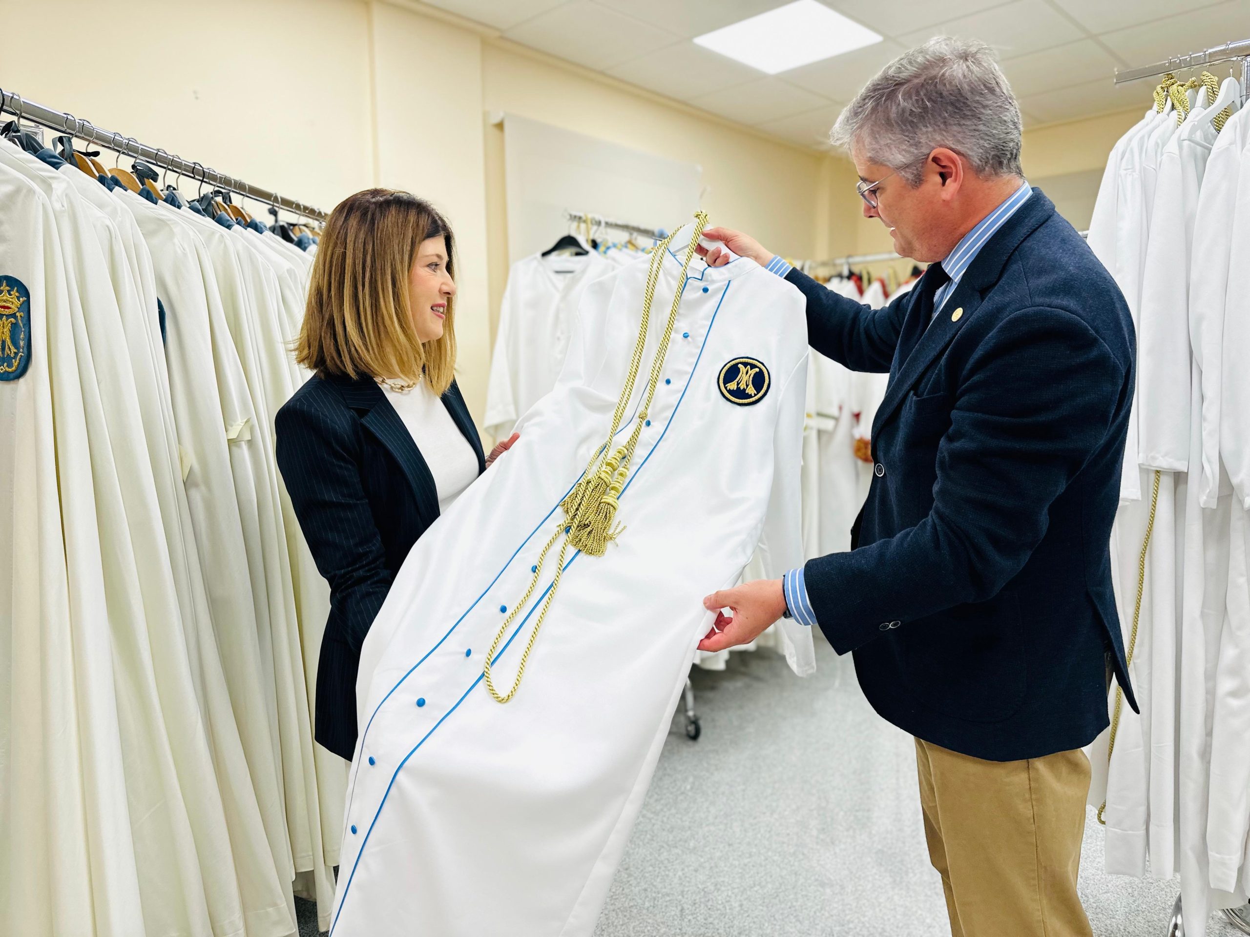 En cuanto a la indumentaria, la Archicofradía estrena 36 nuevas túnicas blancas de algodón para los costaleros de la Virgen, con detalles en azul, anagramas bordados y cíngulos, reforzando la uniformidad y estética del grupo.